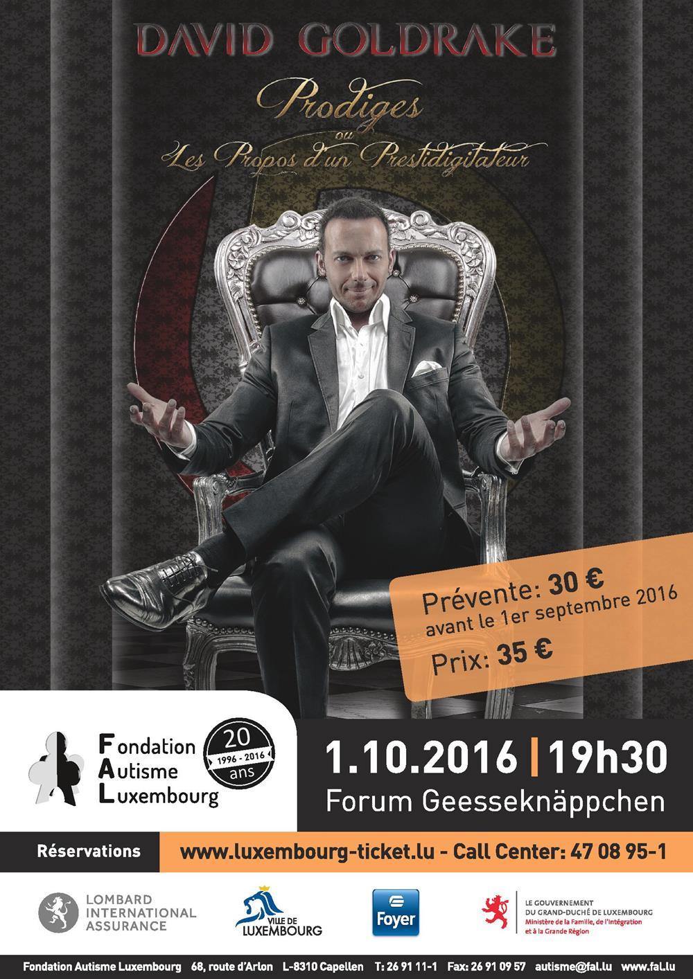 Cette année, la Fondation Autisme Luxembourg fête ses 20 ans. Depuis des années, la Fondation joue un rôle crucial dans l’accueil et la prise en charge des personnes atteintes d’autisme. Beaucoup d’entre vous ont déjà contribué à la concrétisation de ses services et à leur évolution. Il ne va pas sans dire que votre soutien nous est primordial. Nous aimerions donc partager ce moment de fête avec vous. Cette année, ce n’est ni plus ni moins un spectacle de magie, orchestré par David Goldrake, qui vous attend.